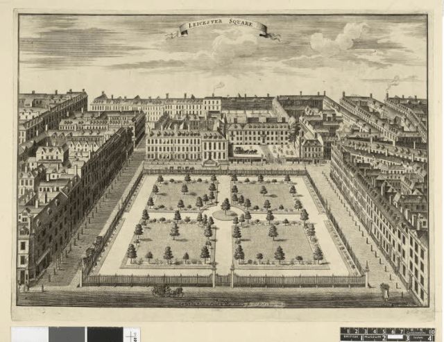 Watch out ! Images can be deceptive – compare this view of the square, from c.1720 geometrically perfect, with the detailed survey map of the same space [below] in 1788 when the Leicester estate was divided and sold.