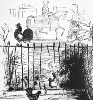 “There was no grass, but there was a feculent, colourless vegetation like mildewed thatch upon a half-burnt cottage. There were no gravel-walks, but there were sinuous gravelly channels and patches, as if the cankerous earth had the mange. There were rank weeds heavy with soot. There were blighted shrubs like beggars’ staves or paralytic hop-poles…on their withered branches, strange fruits- battered hats of antediluvian shape, and oxidised saucepan lids… The surrounding railings, rusty, bent, and twisted as they were, were few and far between. The poor of the neighbourhood tore them out by night, to make pokers. In the centre, gloomy, grimy, rusty, was the Statue – more hideous (if such a thing may be) than the George the Fourth enormity in Trafalgar Square – more awful than the statue of the Commendatore in Don Giovanni.”