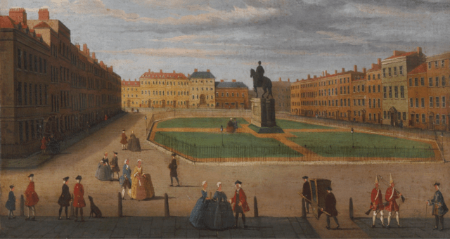 Later in 1747 an equestrian statue of George I was installed in the centre, either by Frederick [to annoy his father?] or the earl of Ailesbury. The statue probably came from the sale of Cannons, the Duke of Chandos’s great house at Edgware, which was sold off piecemeal in 1747 after his death. Ailesbury was one of his heirs. This is the statue described by Sala.