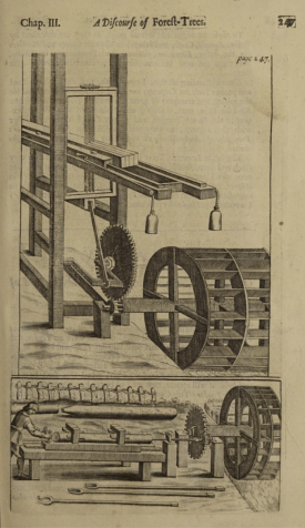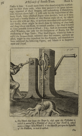 That the use of timber is its underlying importance is reinforced by the images in later editions. They are of machinery to uproot trees, saw them up or make charcoal. Images of trees themselves don’t appear until the much later editions edited by Alexander Hunter.