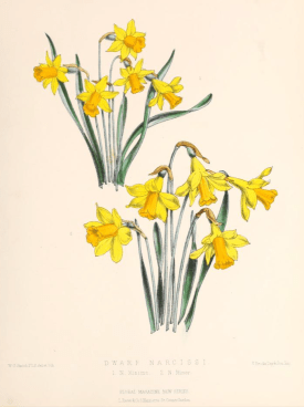 Narcissus growing had already received another boost in 1875 with the publication of The Narcissus its History and Cultivation by F W Burbidge. Burbidge was a writer and artist, who illustrated plants for Barr and worked for as a journalist for William Robinson. When Robinson’s book The English Flower Garden, was first published in 1883, it argued for massed planting of daffodils: “no garden should be without the best of the lovely varieties now known…they are to spring what roses are to summer”