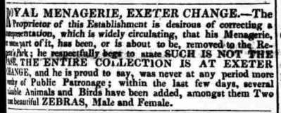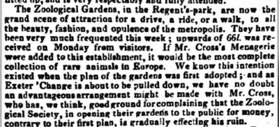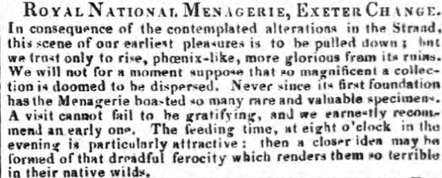 Up until then the only way most people could see any “exotic” animals was to visit a travelling menagerie or one of the large indoor menageries on London. The most famous of these was at Exeter Change on the Strand, which from 1814 was run by Edward Cross.