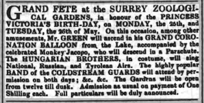 But the tide was turning on such cruel conditions. The public mood shifted towards seeing animals given a little more space and better treatment. Menageries slowly began to close and zoological gardens began to open around Britain: Dublin in 1831, Liverpool in 1832, Manchester in 1836, and Edinburgh in 1839. But the first amongst them was created with the animals from Edward Cross’s menagerie and became London’s other zoological garden, and as far as I’m aware the only one that had a parachuting monkey…