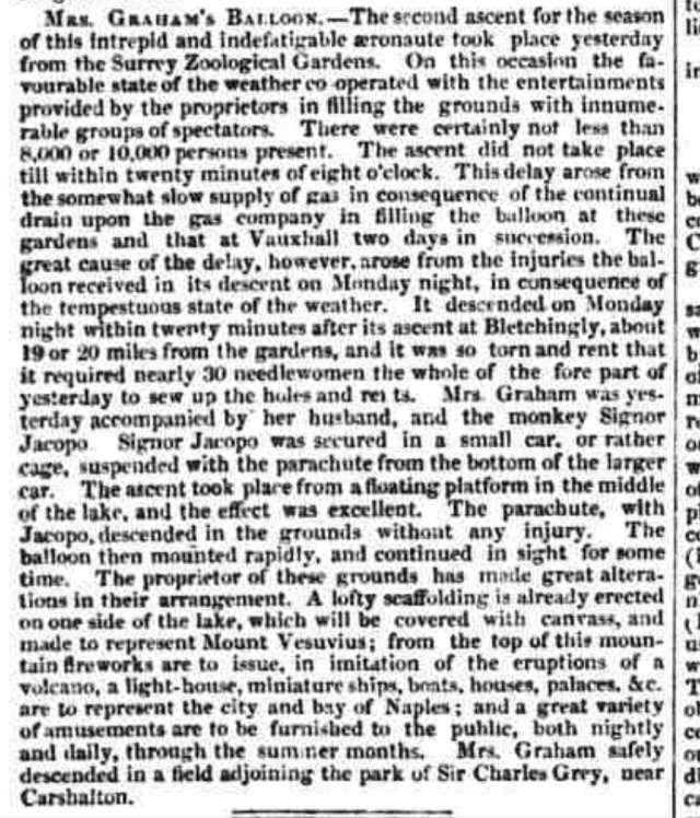 However Jacopo did make several more appearances this time with Margaret Graham, a pioneering female balloonist, in 1837 when he was suspended from the balloon’s basket in a cage attached to a parachute.
