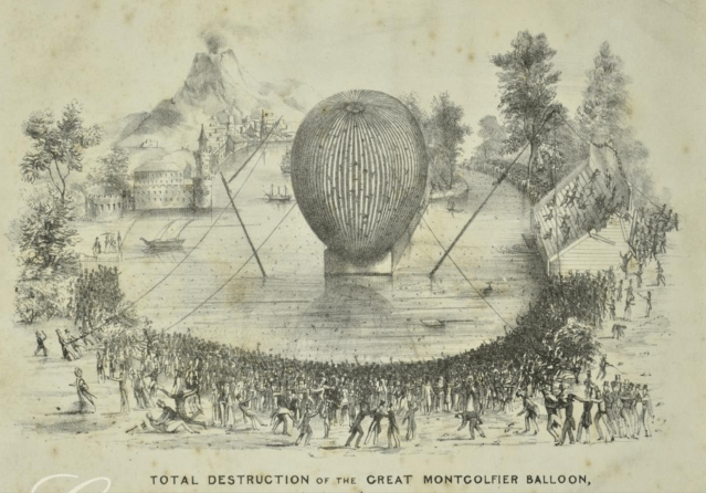 The ‘Montgolfier’ was “a monstrous balloon” said to be ‘of the height of the York Column, with a circumference nearly half that of the dome of St. Paul’s.’ It was laid out on the island and was to ascend at 7 in the evening by which time there were at least 5000 spectators. Unfortunately instead of using gas it was designed to be inflated by burning chopped straw. Unfortunately the design wasn’t very good, the balloon caught fire twice and the flight was abandoned.