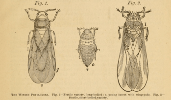 Phylloxera’s three winged forms, from Hilgard’s 1880 paper, “The Phylloxera or Grapevine Louse, and the Remedies for its Ravages.”
