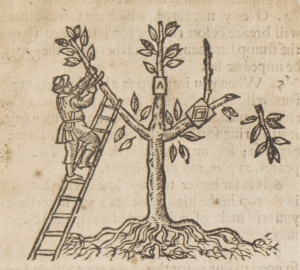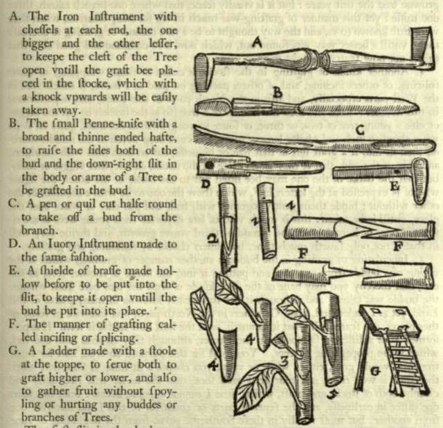 One chapter – Insitions – outlines the basic principles of the techniques involved in grafting, stressing that ‘‘The cyon or thing implanted be of like nature to the stock.’’ But to prove a point he goes to describe experiments he has made himself: ‘: ‘‘I have tried mulberries on Beech, Quinces, Apples, Pears, Elms, Poplars and by grafting they would not take” using that evidence to dispute the claims of other writer. He even tests the grafts suggested as compatible by others and these ” I have often prov’d false by mine own trial.’’