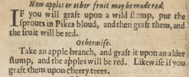But that doesn’t mean they necessarily understood what is going on. Mascall’s book was for the most part a translation of a French text L’art et Maniere de Semer Pepins et de Faire Pepiniere by David Brossar and it’s clear he didn’t test many of Brossar’s other claims. So while Mascall was accurate for some things he also suggests grafting cherry onto crabapple, fig onto peach, and apricot onto fig which don’t work. Even as late as 1654 in The Expert Gardener the anonymous author was giving some rather strange advice…