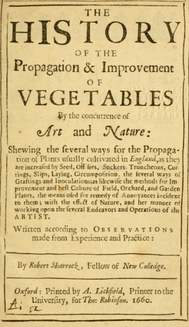 This and ‘‘a multitude of monstrous untruths…in both Latin and English old and new writers’’ are exposed by the first properly scientific writer about horticulture, Robert Sharrock. He was an Oxford cleric and don, and friend of the great scientist Robert Boyle who encouraged him to write a treatise about the propagation of plants. Sharrock combined his own ‘‘observations made from experience and practice,’’ with a good deal of scepticism about the work of others: ‘‘I gave myself the trouble to run over with my eye all books I could procure of the subjects, not intending to trust any.’’ The result was The History of the Propagation and Improvement of Vegetables, first published in 1659 and reprinted in 1672, which was not just a practical text but covered anything relating to the propagation and growth of plants including natural history, botany, natural philosophy and even theology.
