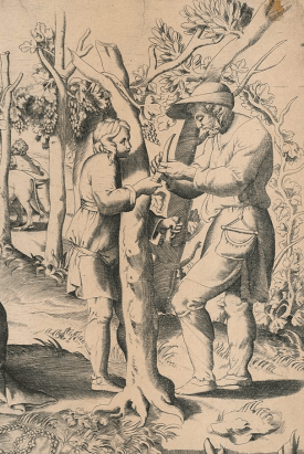 Grafting was seen as an essential skill for a gardener and even for gentlemen as evidenced by the elegant set of knives above. John Parkinson for example has a chapter on grafting “because many gentlemen are much delighted to bestowe their paines in grafting themselves, and esteeme their owne labours and handle work farr above other mens.” There is even a drawing of an Elizabethan aristocrat showing off his grafting skills. He is holding the stock, with some grafts already in place, with tools in his right hand, and more scions being held by the gardener behind him.