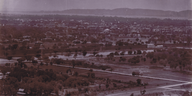 Looking down on the city from Mandalay Hill. The walls of the the huge royal palace enclosure can be sen on the other side of the canal. It had been taken over by the British and renamed Fort Dufferin. Photo by Rodway Swinhoe, a friend of the Cuffes and another founder. Private collection