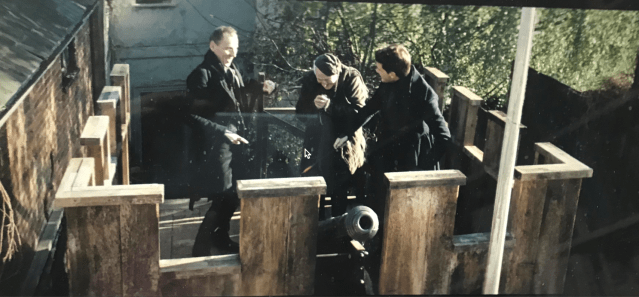 Still from the BBC version of Great Expectations , showing Mr Wemmick, his father “The Aged Parent” and Pip about to fire the Stinger