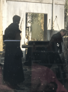 Screen shot from the BBC adaptation of Great Expectations showing Mr Wemmick letting down the drawbridge