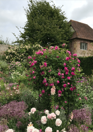 And the surprise continued.  Turning through the narrow archway into the rose garden we were hit by the almost  overwhelming perfume of thousands upon thousands of blooms. We’d arrived at the height of the flowering season for Vita’s prized 19thc varieties, and for the first time I appreciated how magical roses could be en masse. I’m not a great fan of “pure” rose gardens, especially those that are just  bright blobs of colour on the end of prickle-covered sticks.  At Sissinghurst it suddenly made sense.