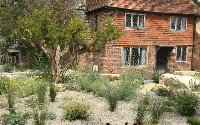Walking in last week was a real shock and an overwhelming impression of grey. Bare rock, huge expanses of gravel and a very open, almost bleak, vista across to the countryside beyond.  Of course a second glance revealed a mass of plants already beginning to spread and show their true colours. It’s a Marmite moment. Visitors either love the boldness or detest the destruction of a loved patch that was undoubtedly much more in keeping with the rest of the garden.