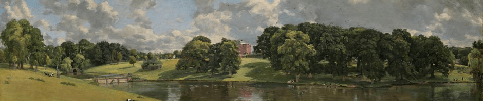 At first glance, says Alison Inglis, “the two paintings would appear to have been executed as a study in contrasts: Wivenhoe Park is a sweeping panorama, full of life and movement, beneath a dramatic, cloud-filled sky. ‘The Quarters’ behind Alresford Hall is half the size, and depicts a single building enclosed by trees – a hushed and secluded scene seemingly devoid of people. Not surprisingly, the straightforward, frontal presentation of the fishing pavilion has been viewed by some writers as ‘more conventional’ than the bold, ‘unaffected’ naturalism of Wivenhoe Park (in which the parkland dominates the distant, partly obscured house).”