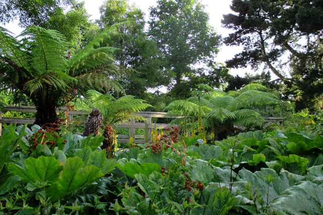 In 2007 a completely different sort of garden opened. Hidden away in a sheltered spot to the side and behind the house, an area planted by the Robinsons was completely reconstructed as a plantsman’s garden and named in their honour. It opened in 2007 and contains an extensive range of rare and unusual species, including more than 150 different perennials and many kinds of ferns planted in sunken dells crossed by two oak bridges and backed by a 3m high gabion wall.