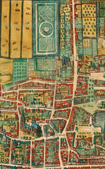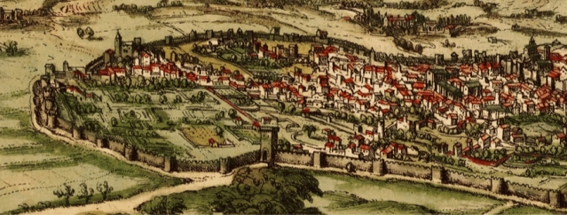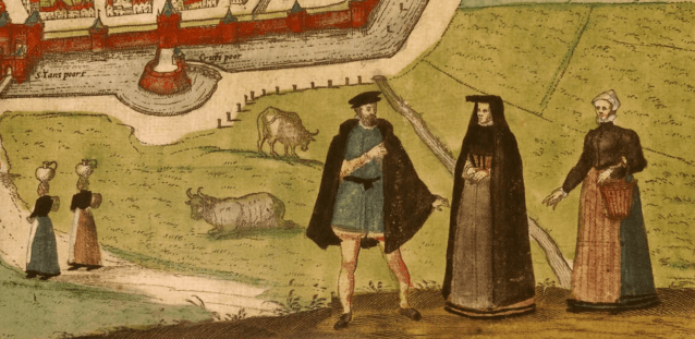 London for example is thought to have had a population of around 150,000 when its image was published. They were largely crammed into the walled city or its immediate suburban parishes and overcrowding is known to have been rife. Yet it’s also true that the city contained areas of houses with large gardens, and was surrounded by common fields. Just as London today is, despite how it might feel at times, one of the greenest cities in the world, so it appears to have been in the later 16thc.