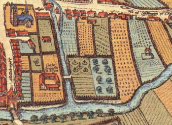 There are often more details about gardens on the outskirts of towns as here for at Arras in Northern France, and occasionally even distinct landscape features such as deer park at Frankfurt.[below]