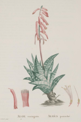 Perhaps the most significant botanically was one that his patron L’Héritier had long wanted to publish: a book on succulent plants. Unfortunately the Revolution destroyed L’Heretier’s fortune and he was unable to proceed. However an enterprising publisher stepped in. Another of L’Heritier’s protégés Augustin Pyramus de Candolle, was asked to write the text while Redouté provided the images. The first section of Plantarum historia succulentarum was published in 1799, with publication continuing intermittently until 1837. This was the first botanical publication for which Redouté was the sole artist and the first to utilise stipple-engraved plates.