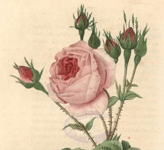 Most famously of course Josephine and Malmaison are associated with roses. The gardens there contained more than 500 varieties, including some tender ones which were cultivated in pots and overwintered in the greenhouses. The empress commissioned Redouté to draw these too and about half were immortalised in Les Roses, although Josephine died before the first part, with text by Claude Thory appeared in 1817. Les Roses went through 3 editions before 1828.