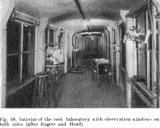 These 3 photos of the East Malling rhizotron come from The Root System Of Fruit Plants by V. Kolesnikov, 1971