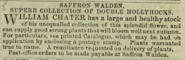 Chater was a nurseryman from Saffron Walden who grew a wide range of plants including, of course, hollyhocks and had been trying to cross them. Another local man Charles Barron had also been growing and crossing hollyhocks for years and had a large collection but still lacked good varieties of most pure colours. In about 1845 Barron proposed that Chater buy his stock and continue his attempts trying crossings between the two collections,