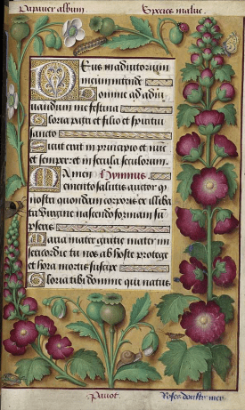 Eleanor of Castile, the wife of Edward I travelled to Palestine with him and legend has it that she brought the seed back to England on their return in 1272. But even if the story isn’t strictly true, because hollyhocks have lots of sturdy easily transportable seeds it’s quite possible that they did come back with returning crusaders. That sounds like the same route they reached France where they’re called roses tremiere. They featured in the Book of Hours of Anne of Brittany [1477-1514], the queen of France, where they are described as roses d’oustremer – roses from overseas.