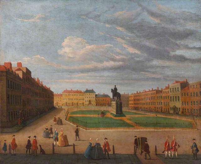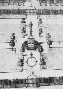 He spent nearly £3000 on the garden which included a mile of elm hedging, 4,100 turfs, 2635 shrubs, plants and evergreens and 3000 flowering shrubs. A contemporary thought the square “is certainly laid out in very expensive Taste, and hitherto kept with great Decency and Neatness; The making it circular is new in Design and happy in Effect”, although while “the Statue in the Centre makes a very good appearance in Prospect and is a fine decoration… in itself is in no way Admirable, or deserving of much Applause.” Nevertheless the garden apparently overshadowed the surrounding buildings which were condemned as “little better than a collection of Whims, and Frolicks in Building without anything like Order or Beauty.”