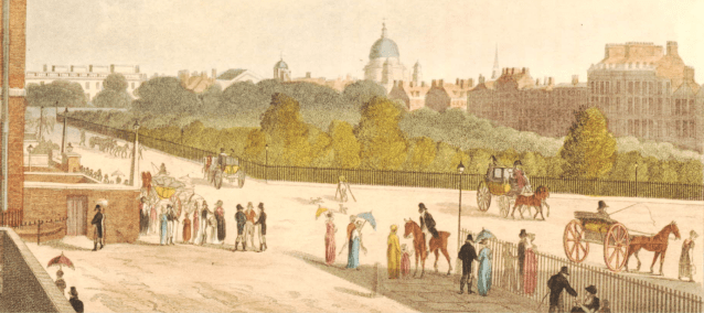 Iron railings became increasingly commonly used, allowing views into the square but keeping the public out. In some places this improved matters: Grosvenor Square installed railings in 1774 in place of a high ‘fence-wall’, which had concealed the garden entirely. By 1800, Lincoln’s Inn Fields was the only one of the great squares which was still completely open to the public and even that was locked very soon afterwards and the edges thickly planted to prevent passers-by peering in.