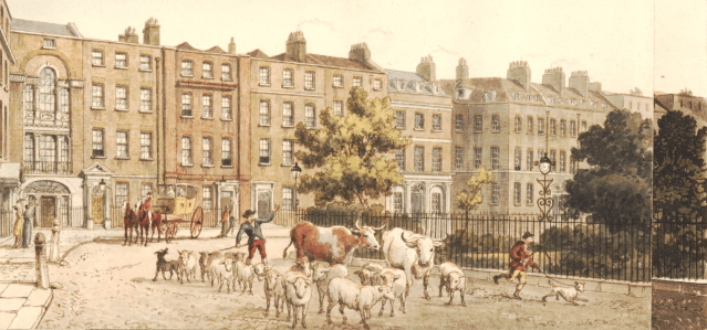 More on London squares. A couple of weeks ago I looked at the beginning of Rus in Urbe – the idea of the countryside being bought into the city and the way that it changed their layout and planting. What I didn’t say then was that in some ways the mixing of urban and rural wasn’t such a strange concept to Georgian Londoners. Elements of the countryside were ever-present. As can be seen from contemporary images animals were still a frequent sight on the streets – and not just going to the markets or butchers. There were sheep in Cavendish Square and cows in St James Park where visitors could buy fresh milk direct from the dairymaids.
