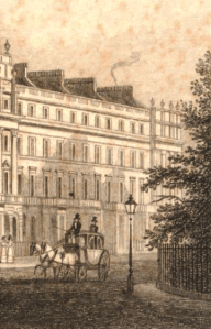 detail of Belgrave Square, 1828 – the print is almost all about the grand houses but the thick perimeter planting is just caught on the edge