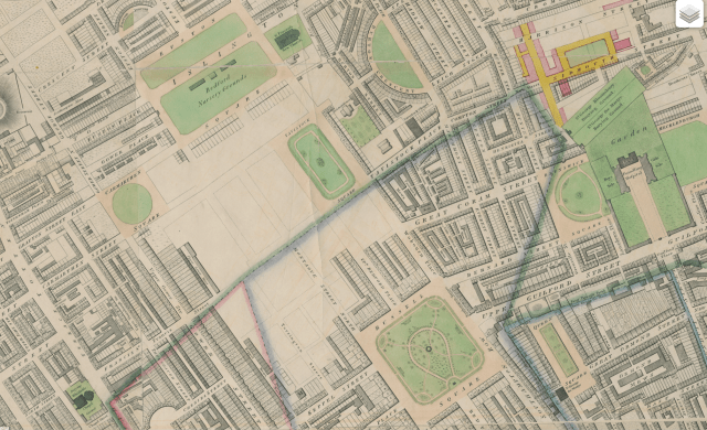 While Cubitt was building fairly centrally, other developments using the square format were spreading much beyond that. A good place to see the extent of this spread into the suburbs is Richard Horwood’s map of London, which first appeared in 1799 with more editions until the 4th updated by William Faden in 1819. This is available in printed form as the A-Z of Regency London, but also on line.