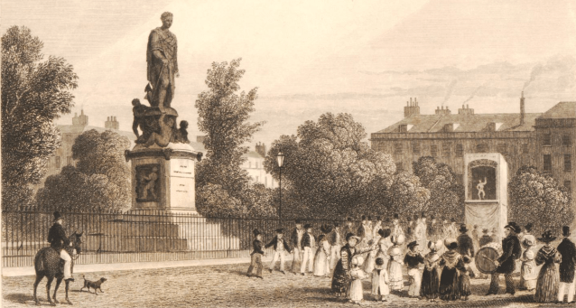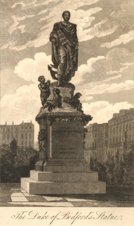 The Duke’s statue on the edge of Russell Square. His interest in agriculture and horticulture can be seen as his hand is on a plough and the four seasons are at his feet . Notice too the thick shrubbery & perimeter planting, 1809