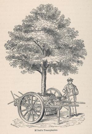 The principle of allowing the tree to partially regrow before removing it underlay the next of the inventions described by McIntosh. This was Standish and Noble’s crate, devised by two nurserymen to help prepare trees in their nursery grounds for moving after they had been sold. These “enterprising cultivators” suggested growing trees “for a season or two in skeleton boxes or cradles” made from elm slats with lots of gaps for the roots to grow through. When planted out in their final position the trees “need not be removed from their crates, as they will be quite rotten before the roots are of sufficient size to be obstructed by them.