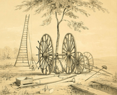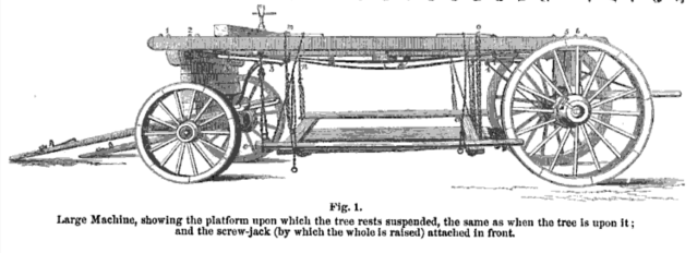 He describes Barron’s machine as “ponderous” which it certainly was. It was solidly constructed out of huge oak beams – the longest 21 feet long – and iron rods, and mounted on a pair of massive broad-tired wheels. Despite this it was easy to disassemble, manoeuvre into position and reassemble. It took me a while to work out how the tree was actually lifted but it is very clever. It involved an advance on earlier systems by getting a cradle right under the rootball. It was clearly hard to do but almost equally hard to describe so follow this link if you want to know the technicalities.