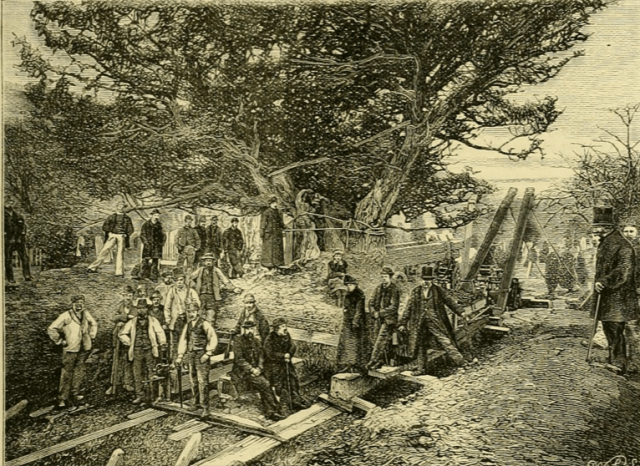Holmes had a slightly more sophisticated approach to the others. It involved not only digging a trench round the tree but also cutting away the ground on one side to create a ramp. The roots were tied into loose bundles and the ground gradually cut away. Next what Holmes called a truck or a sledge which had a tapered metal end and looked like “a ponderous shovel” – was then lowered down the slope on rollers and gradually pushed under the rootball until it was secured on the shovel. The sledge with the attached shovel was then pulled up the slope on the rollers with the tree standing upright on it.
