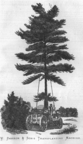 The device was based around a square frame of iron roughly the same size as the rootball to be removed. Attached all round this were a line of adjustable iron cutters, rather like spade blades, a foot wide and 3-4 ft long. They were set at an angle and then hammered into the ground to the required depth, effectively cutting round the tree rather than trenching around it. The frame was then assembled with massive wooden beams, and screw jacks which provided the power to lift the tree out of the ground. When the workmen turned the screws ” the frame and enclosed mass rise erectly upwards. In ordinary circumstances, a tree with a ball of 10 feet, in about 20 minutes’ working of the screws, should be completely raised from the pit.” Once the tree was lifted clear the whole frame could be moved under horse power and taken to the new site where the pit should already have been prepared to take the tree in a reverse process.