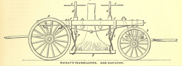 This was reported by Robert Marnock in both ” The Gardeners’ and Farmers’ Journal” and in ” The Forester” Marnock watched some 40ft elms being moved from the edge of a wood the best part of a mile away. Having cleared the ground and trenched the trees, and cut a slope for access workmen dug under the rootball all the way round and “four stout oak planks were placed under this ball of earth in front and behind”. These were chained together and the chains attached to jack-screws. The screws on one side were then turned to slightly lift the planks and with them the tree. Then the screws on the other side were turned and the process continued until the tree was lifted sufficiently clear to be dragged up the slope. Mackay’s machine could lift trees up to 15 tons in weight and cost about £60 to build. A smaller version for trees up to 5 tons cost £25