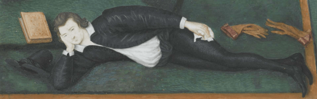 But Percy isn’t shown in such a wild setting, instead he chose to be painted in a plain but formal garden space. Percy’s choice of setting is not accidental. This is a place where art has conquered or at least controlled nature, and cut it into geometric shapes in contrast to the wilderness outside. The garden also seems remote and unattached to any house. This contrasts sharply with another contemporary image, that of the unknown young man sitting leaning against a tree in woodland, who has only temporarily escaped from the very ordered formal garden behind him.