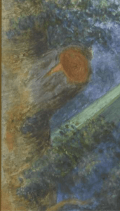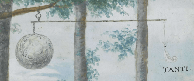Of course the most obviously strange object in the painting is what is hanging from one of the trees. It’s a balance, but not a typical one. Instead of a central hanging point it has what seems to be a globe on a very short length of the bar at one end, and a white feather on the opposite end at a much greater distance. There are several possible, and possibly complementary explanations. The most obvious is a reference to a recently published work by Galileo. His treatise La Bilancetta, [The Little Balance] of 1586 looked at Archimedes work on levers, balances and displacement. Think of the famous quote from Archimedes: “give me a place to stand on, and I will move the world.” and now re-look at the painting. Was the globe the world?