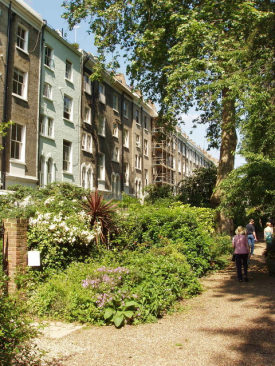 Now, instead of the communal gardens being set across a public road from the houses around them, and thus having to be railed in and screened by shrubs, the whole idea was reversed. The grand stucco terraces and semi-detached villas still faced the streets but while each had a small private garden immediately behind it, these all opened onto a large communal garden shared and controlled by the residents, and visible and available only to them. In the early stages five communal gardens containing over 5 acres of ground in total, were laid out, completely enclosed by housing.