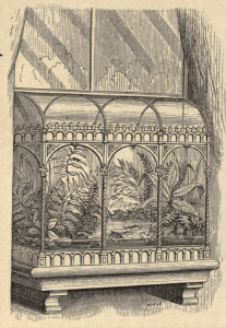 Next “the partiality of the plant for a moist atmosphere and a subdued light renders it peculiarly well adapted for glass cases, whether of an ornamental kind, adapted to adorn an entrance-hall, or for a mere window screen to plant out an unpleasant prospect in a town dwelling.” Hibberd cites examples and suggests using them instead of ferns in glass cases, but also as “a green and fresh screen across a room, being planted in boxes, [with] its sprays trained over rustic framework.”