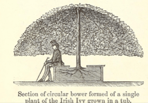 Meanwhile “the fruiting or arborescent ivies are admirably adapted for the formation of compact bushes in the shrubbery, and they may be grown in pots to plunge in flower-beds during winter, or to decorate the conservatory.” This can be taken one stage further and they could be “useful at fetes, and to decorate halls and entrances, and may be adapted to fit into recesses and form dividing screens between apartments, by growing them in troughs fitted with wire work. The troughs should never be larger than can be carried by two strong men.”