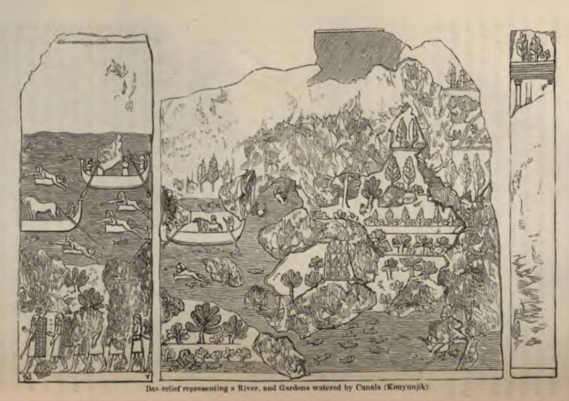It was in 1854 while  working on the  palace of Sennacherib’s grandson Ashurbanipal that a carved relief panel showing a garden was discovered.   Rawlinson immediately recognised the mountainous features described by the classical sources, which are supposed to have  resembled the mountains of the queen’s homeland in modern Iran.  He suggested it represented the Hanging Gardens of Babylon, although  he later decided the relief was merely a forerunner of the Babylon gardens.