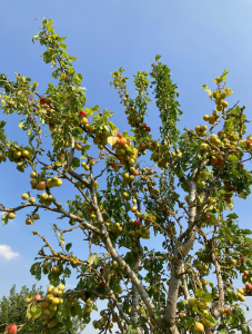 These included Great Green Costard, Dr Harvey and Winter Queening apples, Madingley, Hawksbill and Winter caterne pears, together with walnuts, plums, medlars and cherries. Over the last 20 years the NT have been replanting the orchard with those they have been able to obtain from the National Collection at Brogdale. These have been grafted onto vigorous rootstock [no M9 or St Julien dwarfing stocks in the late 16thc] and planted according to Tresham’s instructions.