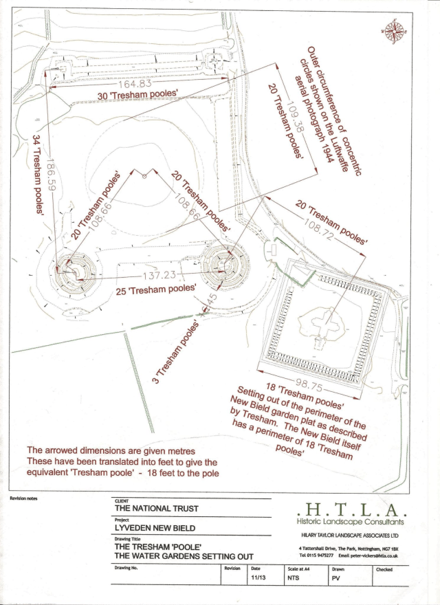 A survey by by Hilary Taylor Landscape Associates Ltd.in 2013 looked at the spacial relationships between the main features of the site, including the parterre garden, and showed that they conform to a clear, but perhaps not immediately obvious, mathematical pattern. The parterre also aligns perfectly with the arm of the lodge and is 20 “pooles” away from it, the same distance as the top of the nearer spiral mount.
