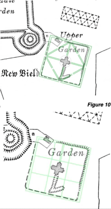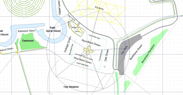 The recent work has been to investigate the possibility that these mathematical connections could extend further. You can see that the lodge, mount and the centre of the parterre are part of a potentially bigger pattern. Is this just a fortuitous coincidence or did Sir Thomas intend to extend his garden further in other directions and put the lodge in the centre of a much larger emblematic/symbolic garden? I’m convinced but go and read Mike Rogers’ account and make up your own mind!