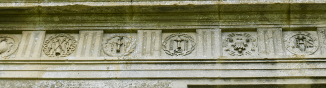 Catholic symbolism is overtly “hidden” in the building’s decoration too. The ornamental frieze is based on the Italian architect Serlio’s pattern books but adapted to show the seven emblems of Christ’s passions. The Greek letters IHS for Jesus and Chi-Rho XP for Christ also occur prominently, but look at the component elements. There are also Biblical inscriptions, the names of Jesus and Mary, and the Tresham coat of arms with its trefoils which serve as a symbol of the Trintuiy.