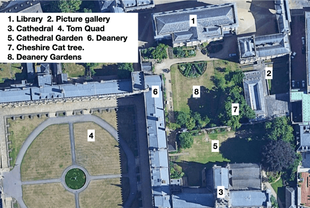There are two gardens at Christ Church which have Alice connections. The first is the Cathedral Garden which was originally part of the precinct of St Frideswide’s, the priory shut down by Cardinal Wolsey when he founded his college.